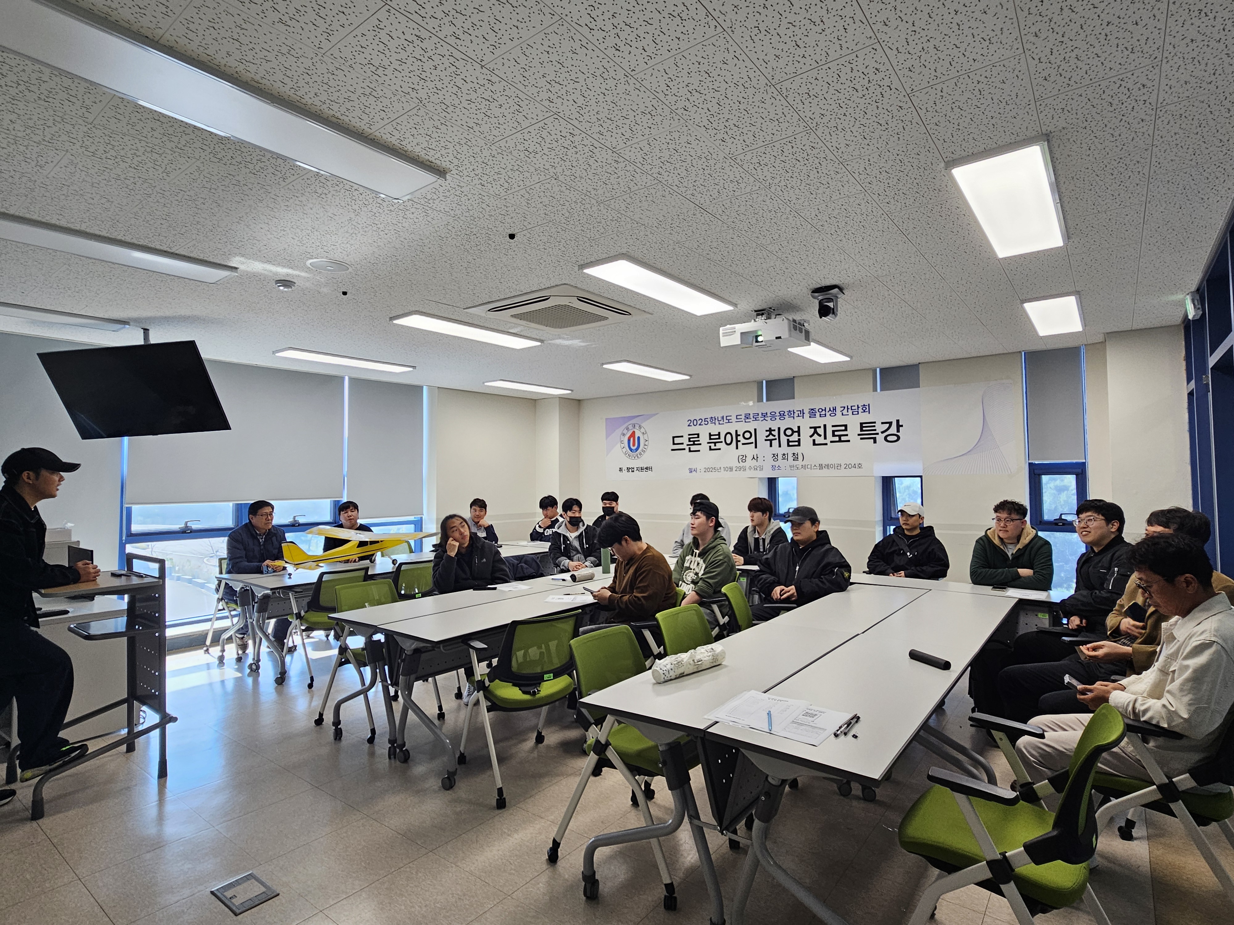 -졸업생(정희철/2025년 졸업, 남경무인항공, 교육팀 교관; 조민혁/2023년 졸업, 현재 현역 공군)을 초청하여 취업 진로에 대한 조언, 후배들이 궁금한 것 중심으로 간담회 진행함. 간담회 목적한 대로 드론 관련 최신 동향과 실무 지식을 제공하여 학생들의 현장 대응력을 강화하는 것, 드론 산업 현장의 실질적인 사례와 노하우를 공유함으로써 진로 탐색 및 취업 경쟁력을 높임, 창의적 사고와 전문성 향상을 통해 드론 산업의 다양한 분야에 대한 이해를 넓힐 수 있도록 진행하였음. 취업 관심이 있는 재학생들과 졸업생 외에도 드론로봇 관련 현업을 하고 있으신 김석주 교수님, 노준혁 교수님, 장문광 교수님, 학과장 류주환 교수님이 참여하여 현재 유원대학교 드론로봇응용학과 재학 중에 취업을 위해서 어떤 것을 준비해야 할지, 취업을 위해서 학업, 대학 생활을 어떻게 할지, 중소기업부터 대기업, 공공기관 취업 전략, 대학 과정에서 포트폴리오 전략, 졸업 후 드론로봇 분야 장기적인 진로 설계 등의 설명 등 종합적인 가이드를 제공하고, 학생들과 격의 없는 대화를 나누었음. 사전 행사로 1부에서 레이싱 드론 시연/설명(정희철 졸업생), 현업에 사용되는 방재 드론 교육(장문광 교수님), 복합센서 드론 실습교육(김석주 교수님) 등을 실외 연습장에서 진행하였음.