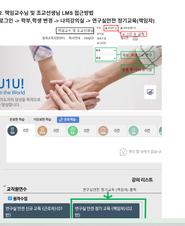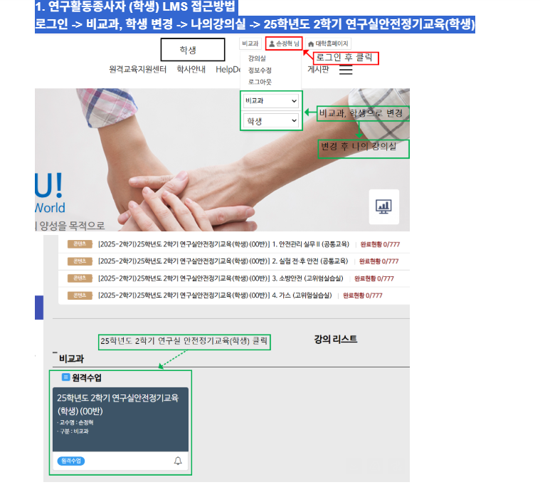로그인 -> 비교과, 학생 변경 -> 나의강의실 -> 25학년도 2학기 연구실안전정기교육(학생)