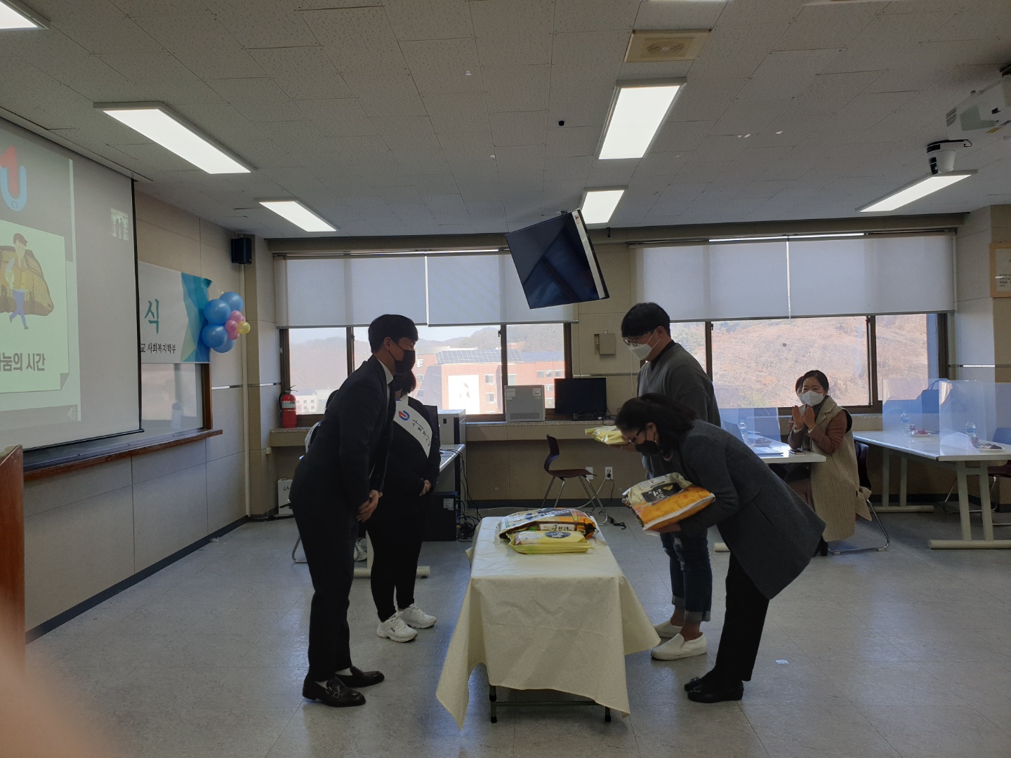 - 참여자: 오미희 교수님, 허 욱(4학년), 정수연(3학년), 최은지(3학년) - 주관: 영동군지역사회보장협의체 - 협력기관: 유원대학교 사회복지학부, 장애인복지관, 교육지원청, WEE센터 등 - 기간: 12월 6일(월) 15시 30분~16시 30분까지 : 영동읍사무소 2층 소회의실에서 '위드코로나 영동군민 마음건강 챙기기' 통합 서비스 상담을 진행하였습니다. 스트레스, 우울증, 코로나블루, 65세 이상 어르신 일상생활 체크리스트를 통해 전문가 및 사회복지학부 오미의 교수님, 재학생들과 함께 대화를 나누며 공감과 위로를 전할 수 있는 뜻깊은 활동이였습니다. - 주관: 영동군지역사회보장협의체